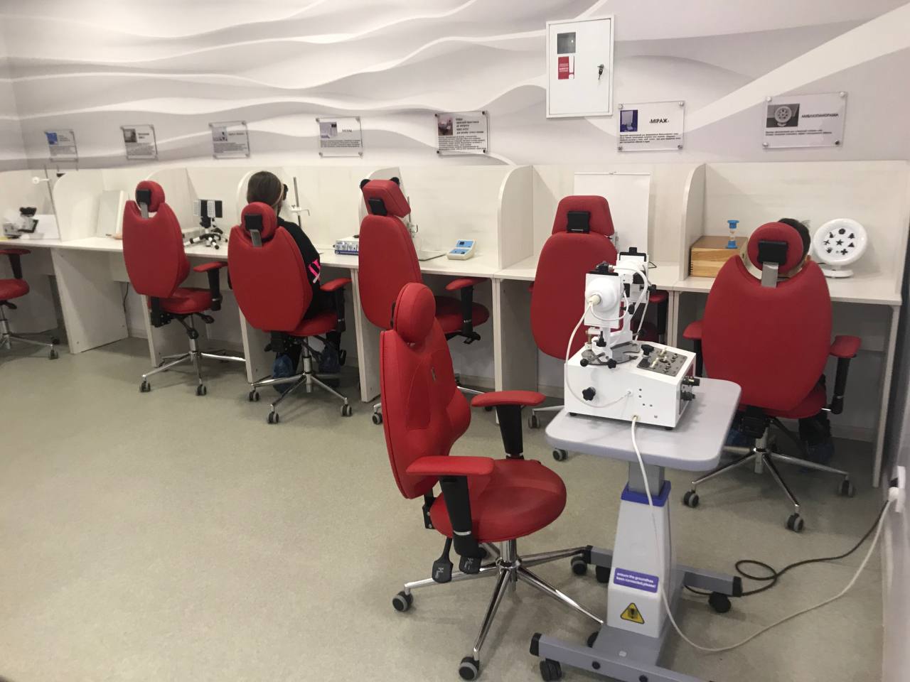 Прилад КАСКАД, окремий апарат для тренування акомодації, конвергенції і лікування амбліопії, для лікування спазм акомодації, короткозорості шляхом впливу на око динамічно змінним в часі і просторі колірними стимулами і з додатковими контрольними стимулами) Конструкція пристрою дає можливість стимуляції як кожного ока окремо, так і обох одночасно, а також тренувати бінокулярний зір.